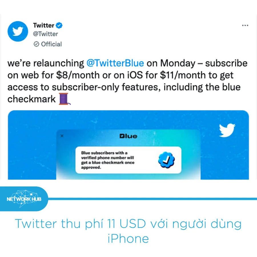 Để bù đắp cho khoản phí 30% trên App Store, Twitter sẽ thu 11 USD thay vì 8 USD mỗi tháng với người dùng iPhone muốn có tích xanh. Twitter thông báo sẽ mở lại dịch vụ bán tích xanh vào ngày mai 12/12. Với tài khoản Twitter Blue, người dùng có thể chỉnh sửa tweet, đăng video 1080p và một số ưu tiên khác.